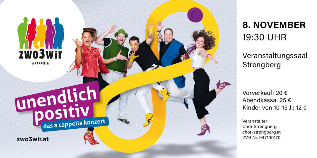 Zwo Drei Wir Am 8. November 2025 gastierte die Vokalband zwo3wir mit ihrem Programm „unendlich positiv“ im ausverkauften Unterbergerhof in Strengberg. Mit viel Persönlichkeit, musikalischer Präzision und spürbarer Bühnenfreude begeisterten die fünf Sänger:innen das Publikum von Beginn an. Die Mischung aus Popklassikern, Eigenkompositionen sowie der markanten Kombination aus Beatbox, Bass und feinem A-cappella-Sound sorgte für […]
