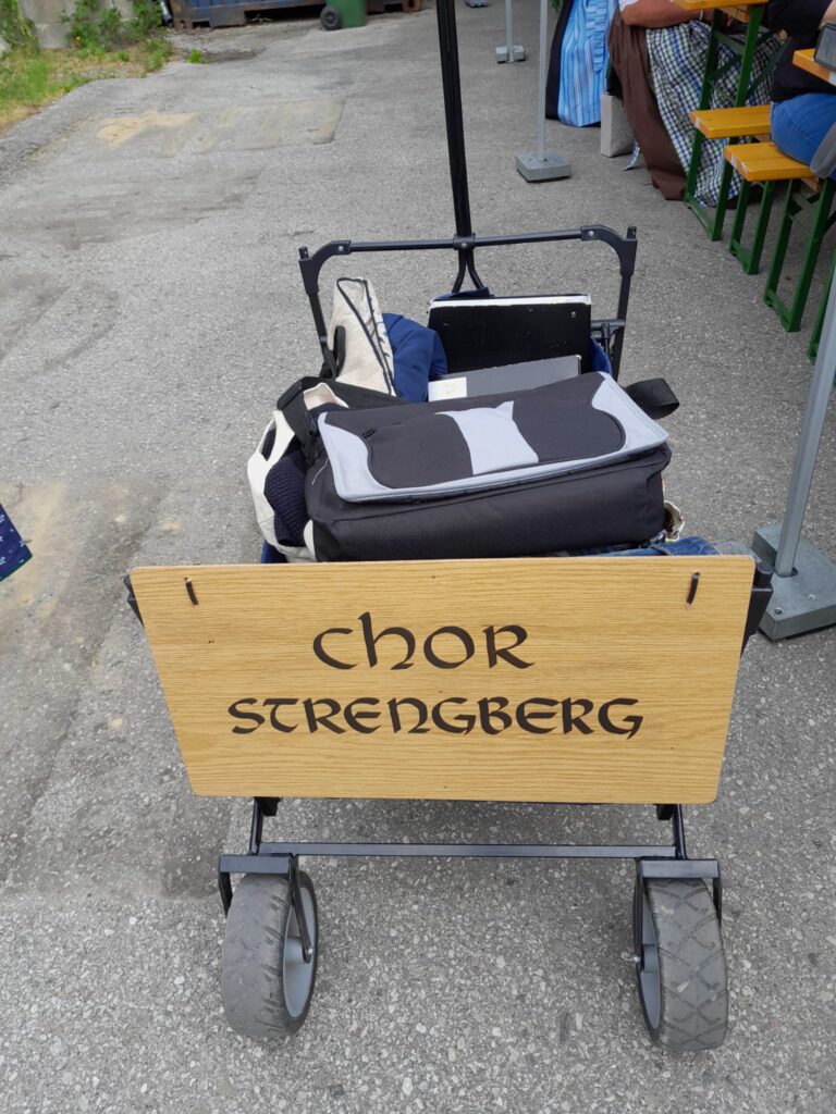 Da wir bereits früh aufstehen mussten und keine Zeit zum Einsingen hatten, ergriffen wir bei der ersten Station einfach die Gelegenheit und gestalteten mit allen Chören ein Einsingen. Da sich unser Chorleiter vorab nicht entscheiden konnte, welche Stücke wir aufführen, mussten wir unsere sogenannte „Dicke Chormappe“ mitschleppen. Doch mithilfe unseres Bollerwagens konnten wir uns stressfrei mit bunt gemischtem Liedergut in die Herzen der Wolfsbacher singen.